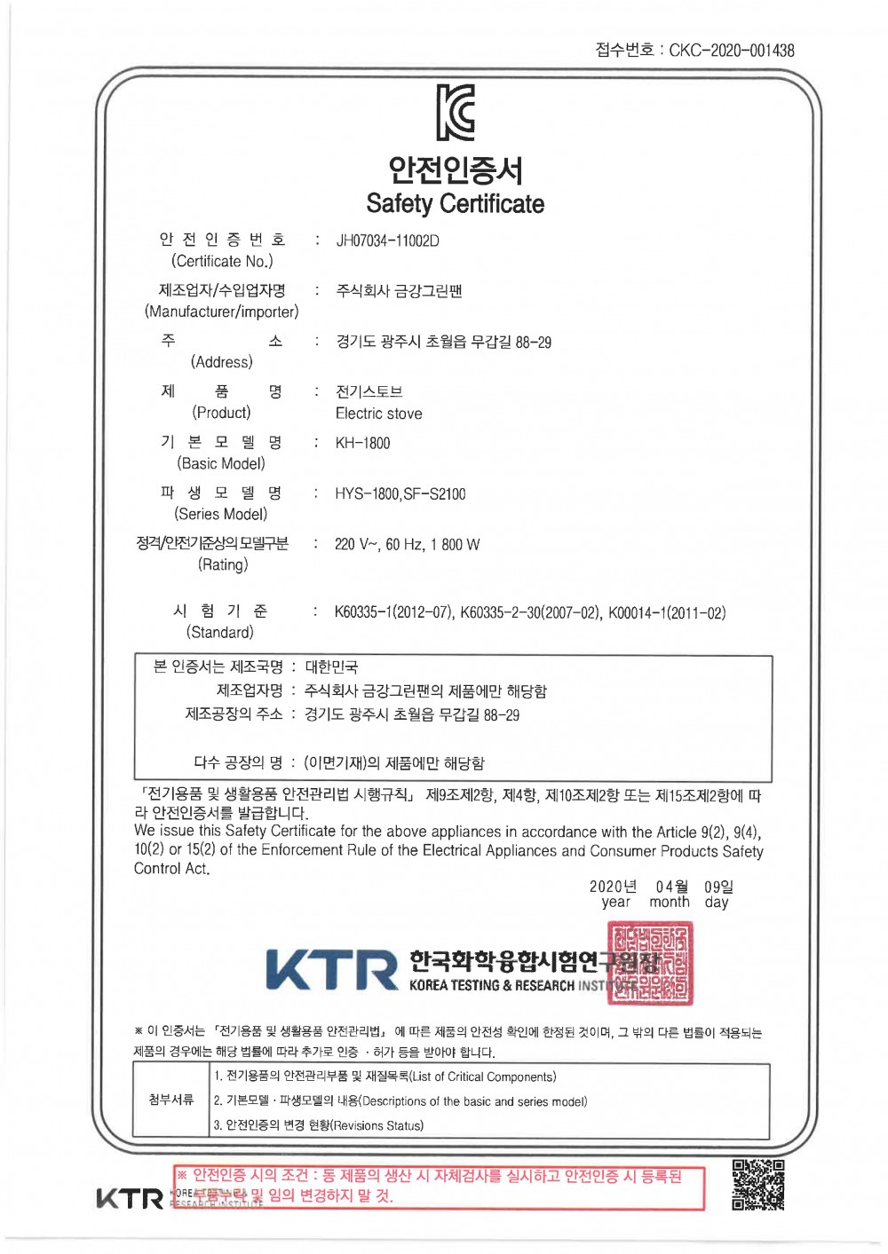 KC 안전인증 | KH-1800